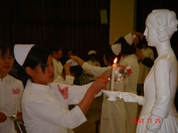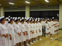 今日戴帽式を迎えることができてとても嬉しく思います。4月からあっという間の半年間だったので、もう戴帽式なのかと思うと落ち着きませんでした。しかし、ナースキャップを頂き”私は看護の道を歩んでいるのだ”と実感しました。先生方や来賓の方々から祝ってもらい感謝の気持ちでいっぱいです。これからの実習や学習に精一杯頑張って准看護師の資格を取りたい。キャンドルの灯りを持って歩いている時、心の中が透き通っていくように感じ、人の役に立ちたいと思いました。これから先、辛いことがあっても今日のこの素直な気持ちを思い出して、立派な看護師を目指して努力していきたい。