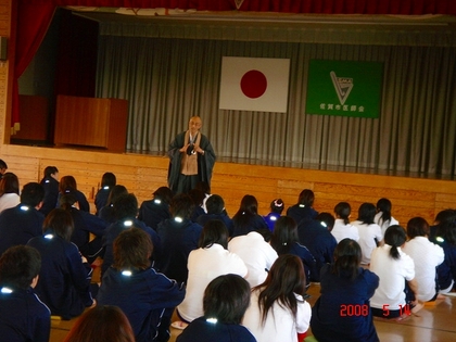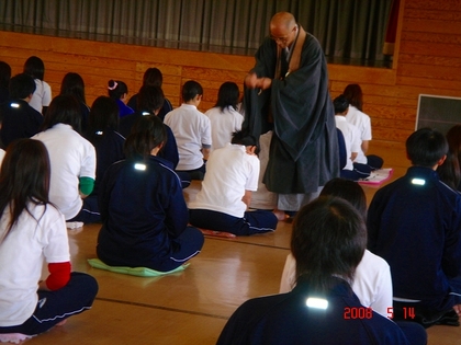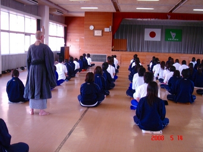 100人ほどの生徒が一斉に静かになり、その静けさにびっくりし、また、普段は聞こえない鳥や車の音が聞こえました。“無”にするということは難しく、“無”にしようと思えば思うほどいろんな考えが頭の中に浮んできて、そのたびに頭の隅に押しやるという新鮮な体験ができました。