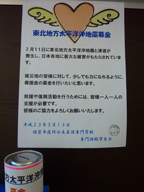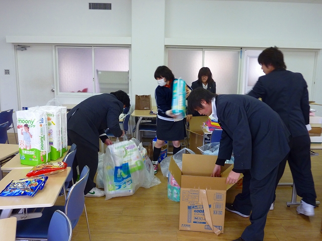 学生会(大島伸也会長)は東北地方太平洋沖地震の被災地の方々の少しでも力になりたいと思い、学生・生徒・教職員に協力を呼びかけ、募金活動と支援物資の受け付けを行っています。3月19日までに3回の物資を被災地に送りました。会長は「今後も活動を続けて行きます!」と述べています。