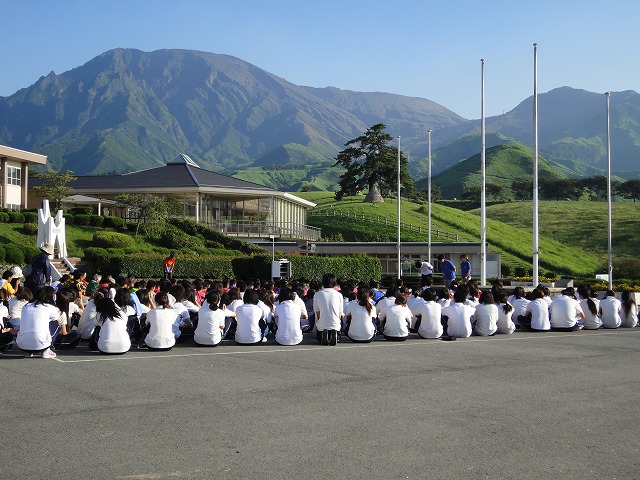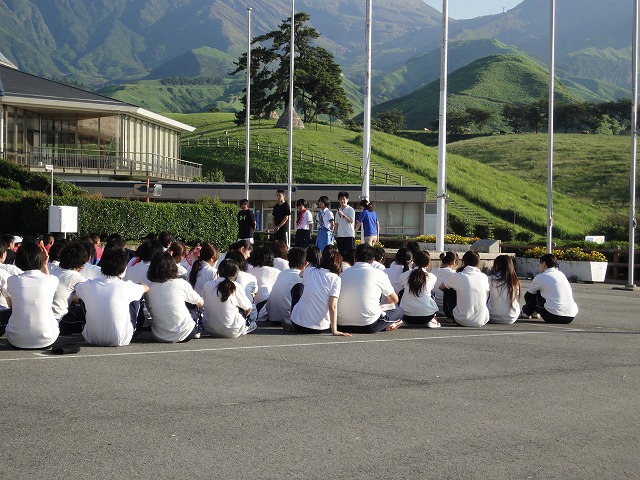 阿蘇宿泊研修に行く前は、集団行動が苦手な私にとってとても不安でした。しかし研修が終わった今は集団行動の大変さの中に、新しい出会いや周りの人の良い所、自分自身のことを知ることができました。初めに阿蘇青少年交流の家に到着した時は自然いっぱいの草原と牛たちに清々しい気持ちになり、研修を頑張ろうと思いました。人間関係づくりの学習では、Bクラスの人とグループを組み、様々なゲームを行ったり、力を合わせていくことで協調性の大切さを学ぶことができました。また、私は普段はあまり前に出て積極的に行動する方ではありませんが、仲間の協力のおかげで、班長の役割を果たす事ができ、責任をもって行動することの大切さを学びました。仲間の大切さやクラスの絆を深める事ができた研修になったと思います。