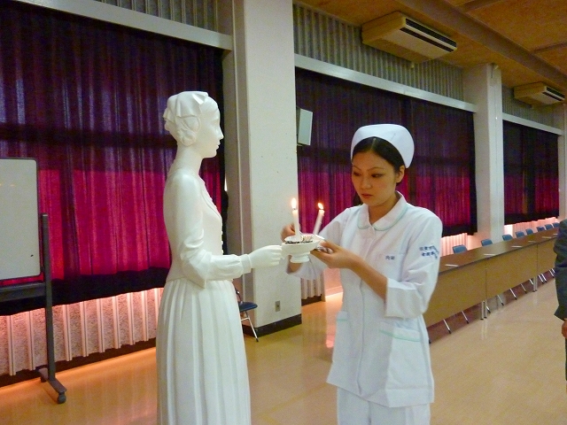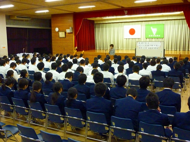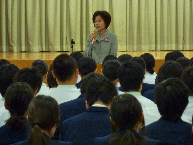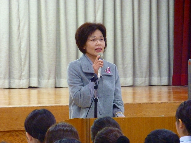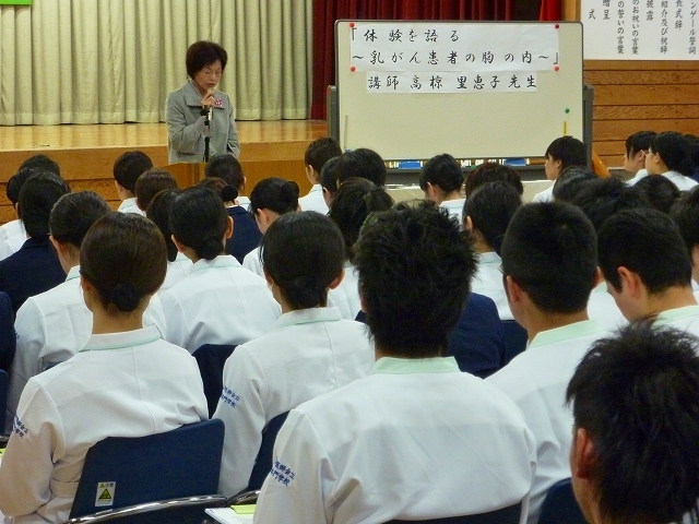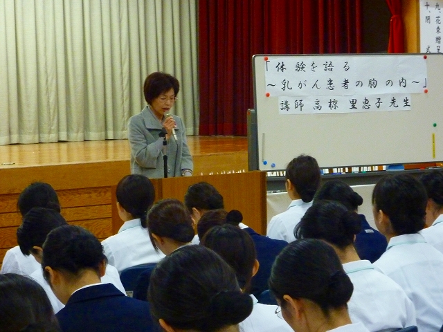 戴帽式を迎えるにあたり、毎年式の前に患者の心理の教科目の一環として「記念講演」を行っております。今年は、乳がん患者会「あじさいの会」の高椋里恵子 様より「体験を語る・乳がん患者の胸の内」のテーマで大変貴重な自らの体験談を講演して頂きました。