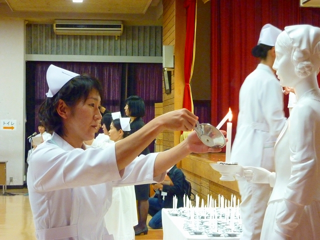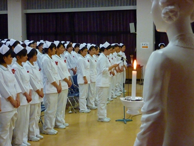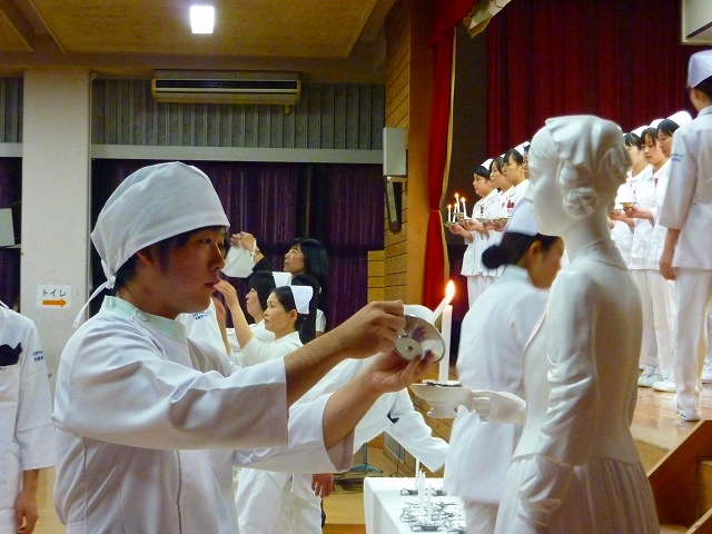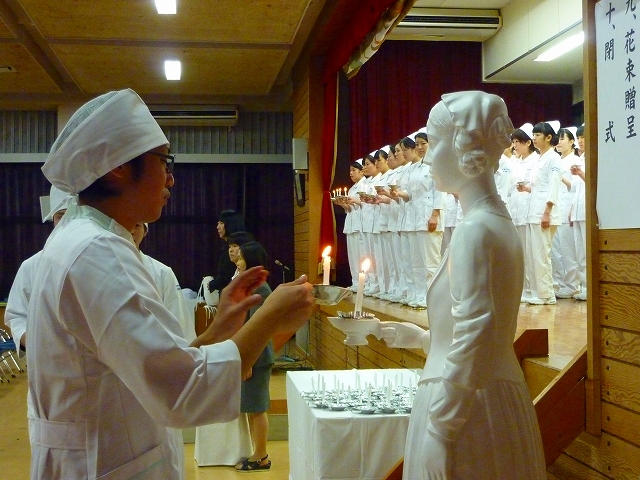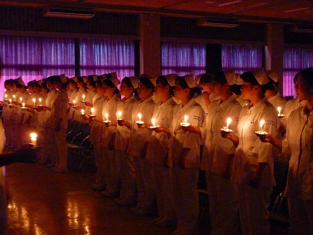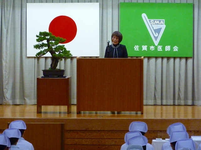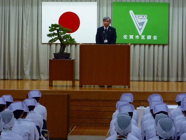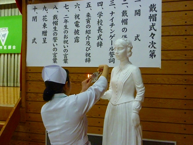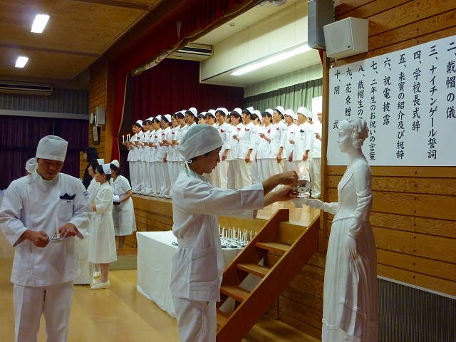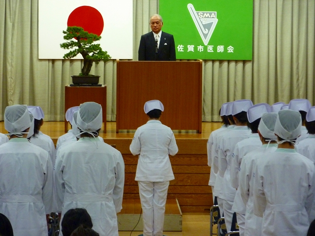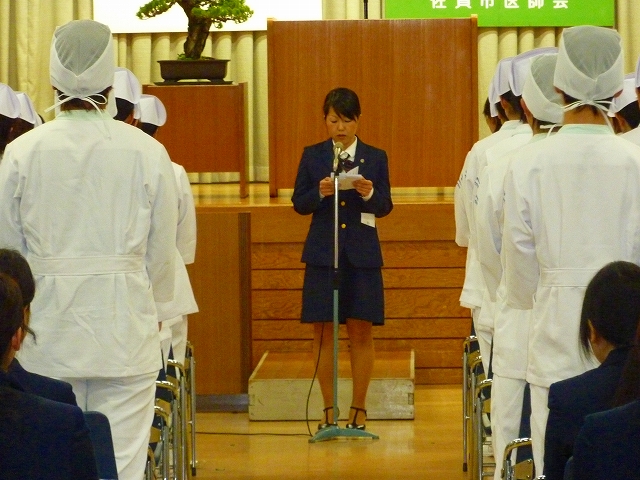 式では、山下副校長から戴帽生一人一人がナースキャップをかぶせてもらい、その後ナイチンゲール象のろうそくから炎を頂き「ナイチンゲール誓詞」を全員で唱和しました。学校長式辞の後、佐賀中部保健福祉事務所長 平野重愛 様、鮫島病院 看護部長 吉村清恵 様より心あたたまるご祝辞を賜りました。