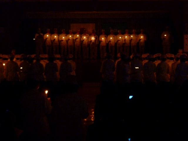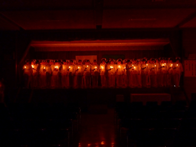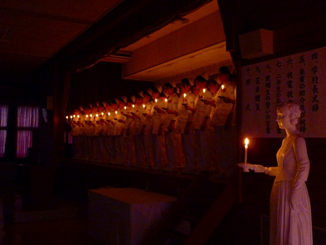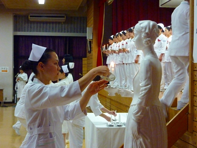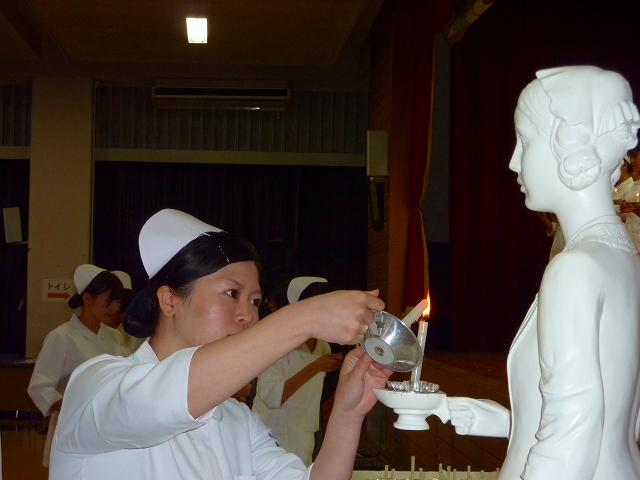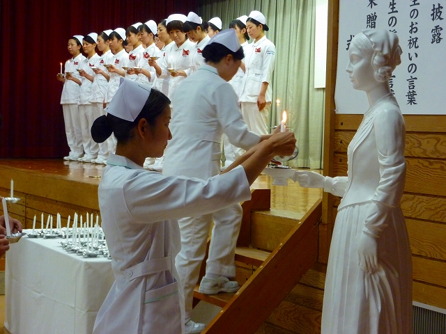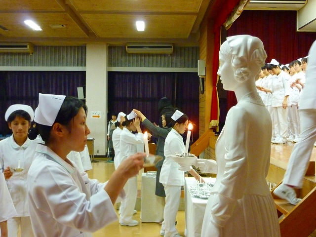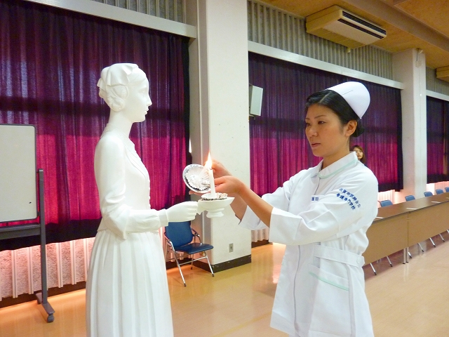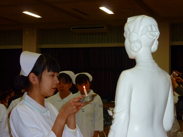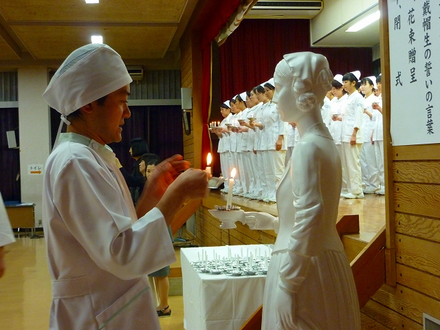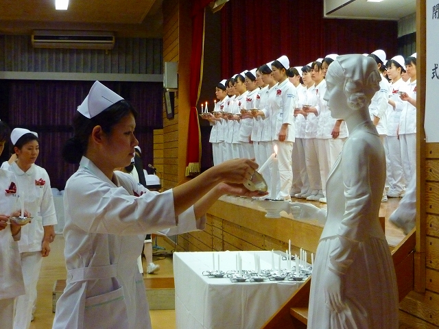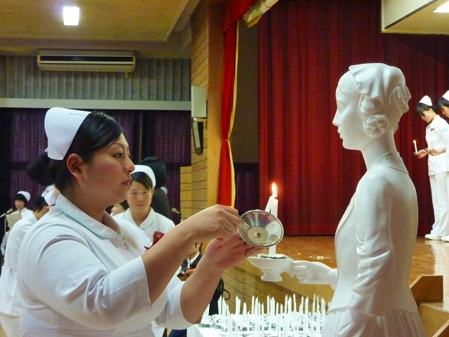 式では、山下副校長から戴帽生一人一人がナースキャップをかぶせてもらい、その後ナイチンゲール象のろうそくから炎を頂き「ナイチンゲール誓詞」を全員で唱和しました。学校長式辞の後、佐賀中部保健福祉事務所長 平野重愛 様、鮫島病院 看護部長 吉村清恵 様より心あたたまるご祝辞を賜りました。