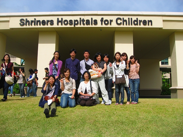 今回ハワイ研修で一番印象に残ったのは、シュライナーズホスピタルの見学です。シュライナーズホスピタルは子供専門整形外科病院ということだが、外観は一見病院とは思えない佇まいで、まるでホテルか博物館のようでした。玄関を抜けると正面に水槽が設置されていて、形が円をかたどっていて車椅子の子どもも見やすい設計となっていました。1階は海、2階は山・土地がテーマとなっていて、エレベーターの外壁にはタイルでテーマを彩ってあり、無機質な感じが無く、手作り感のある温かみのある雰囲気がありました。院内は病院であることを忘れてしまうような作りになっていました。子どもが病院を恐れないように、そして遊びを治療に取り入れられていました。
