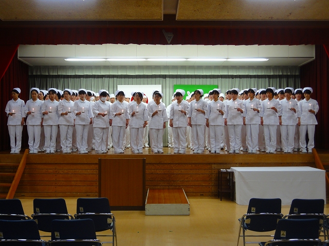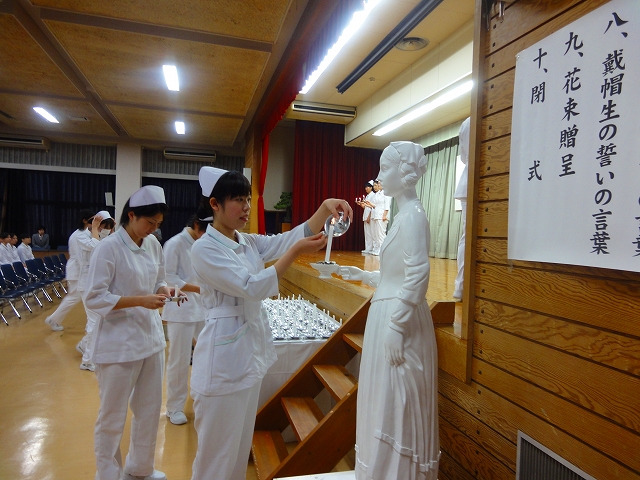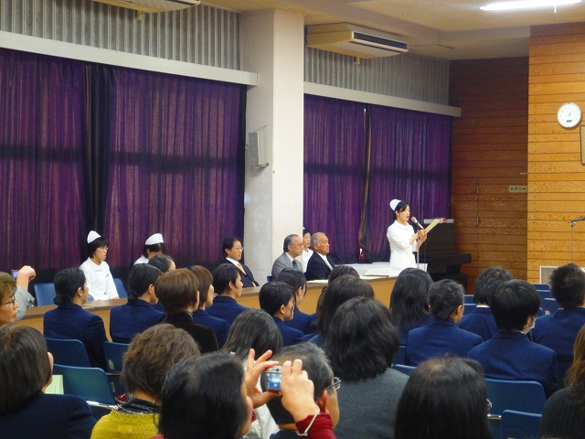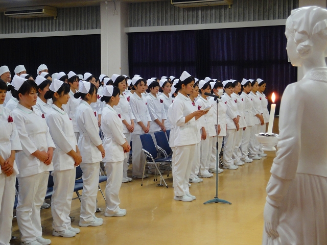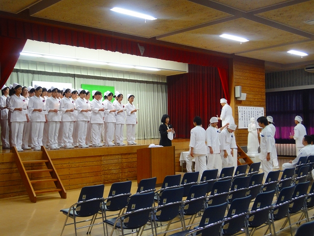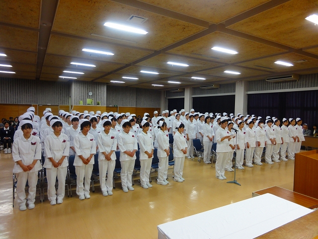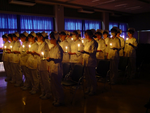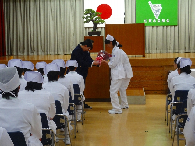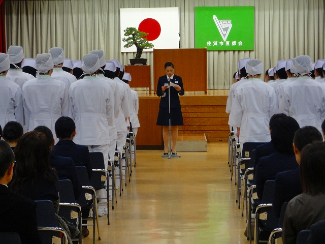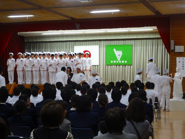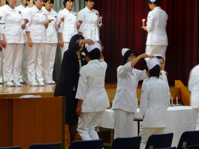 式では担任による呼名の後、山下副校長から一人一人がナースキャップをかぶせてもらい、その後「ナイチンゲール像」のろうそくから炎を頂き全員で「ナイチンゲール誓詞」を唱和し、看護職を目指す決意を新たにしていました。ました。上村学校長式辞の後、佐賀中部保健福祉事務所長 平野重愛様、国立病院機構佐賀病院 看護部長 佐伯悦子様より心あたたまるご祝辞を賜りました。戴帽生は12月より臨地実習に臨みます。