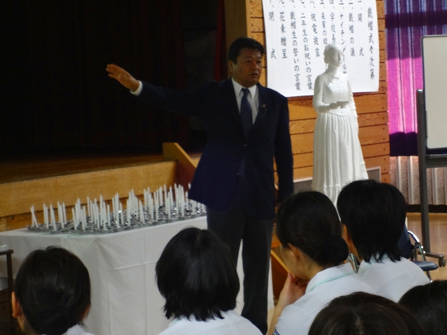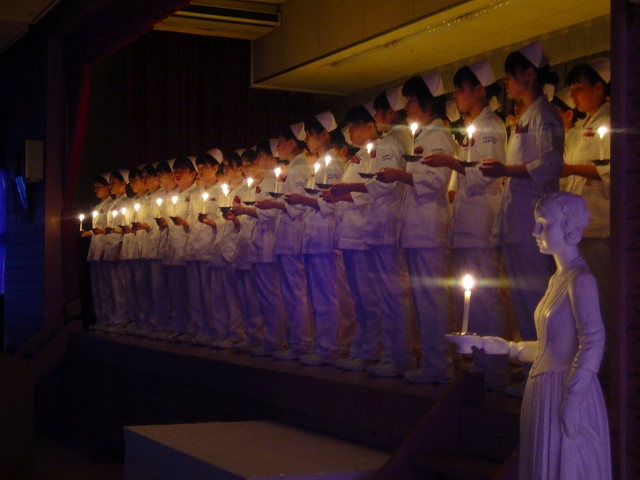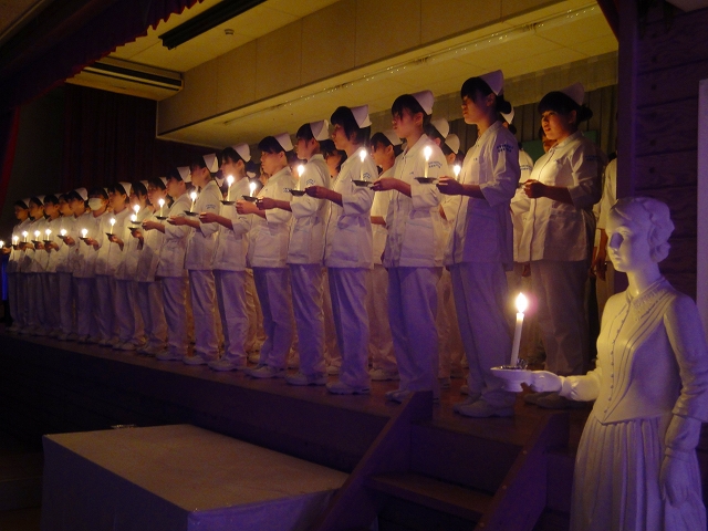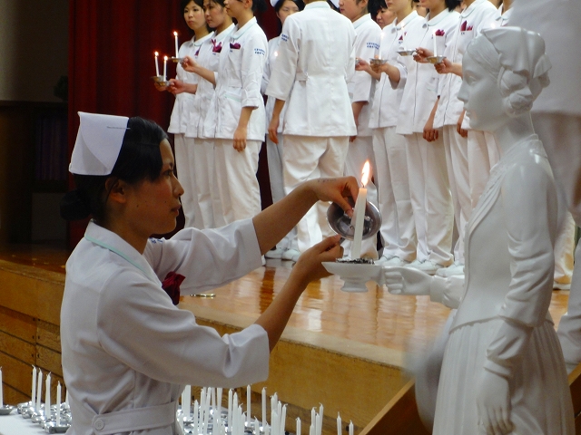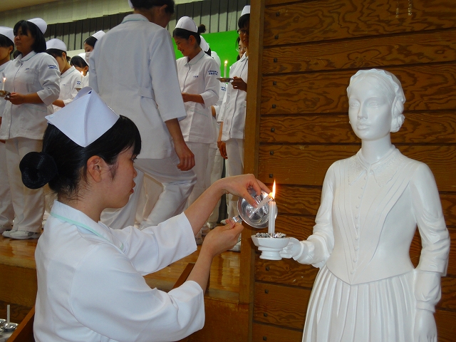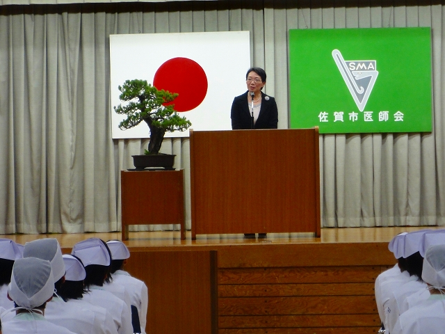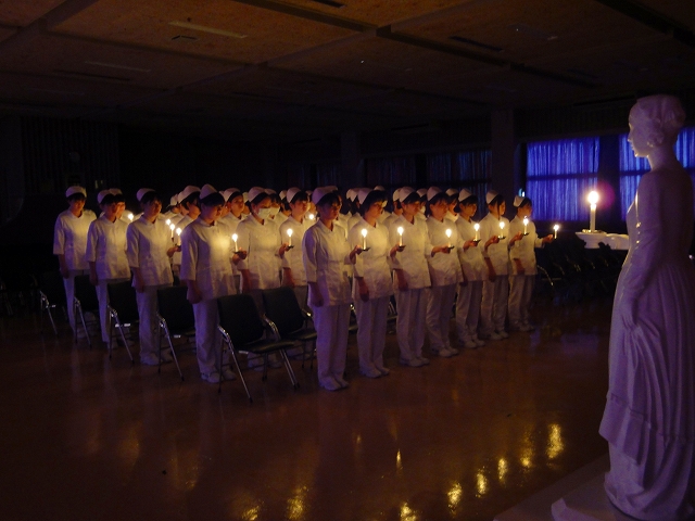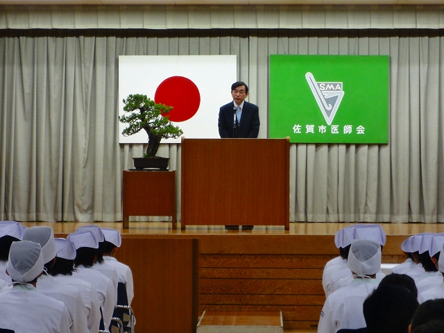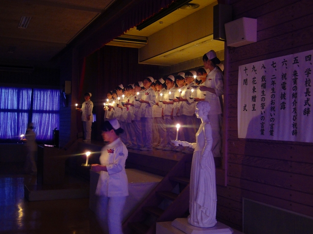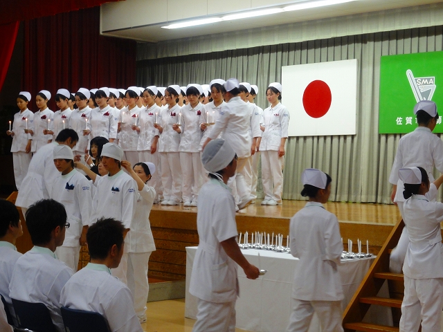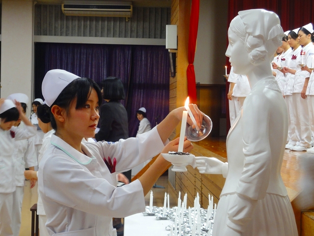 式では担任による呼名の後、山下副校長から一人一人がナースキャップをかぶせてもらい、その後「ナイチンゲール像」のろうそくから炎を頂き全員で「ナイチンゲール誓詞」を唱和し、看護職を目指す決意を新たにしていました。ました。上村学校長式辞の後、佐賀中部保健福祉事務所長 平野重愛様、国立病院機構佐賀病院 看護部長 佐伯悦子様より心あたたまるご祝辞を賜りました。戴帽生は12月より臨地実習に臨みます。
