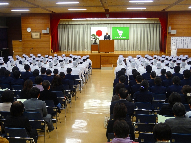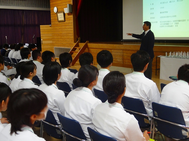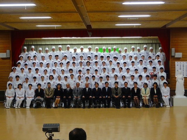 高等課程1年生(平成23年度生)96名の「第35回戴帽式」が、平成23年11月26日(土)午後1時より本校講堂に於いて挙行されました。戴帽式を迎えるにあたり、毎年式の前に患者の心理の授業の一環として「記念講演」を行っております。今年は「腎友会」の佐藤博通様(佐賀県腎臓病患者連絡協議会 副会長)より「透析患者からのメッセージ」のテーマで大変貴重な体験談を講演して頂きました。