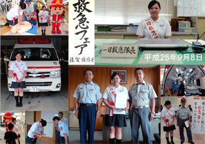 専門課程3年生、筒井美早さんが9月8日(日)平成25年度「救急の日」に佐賀消防署の「一日救急隊長」に任命されました。佐賀署内で任命式の後、ゆめタウン佐賀で市民の方々へ救急医療や救急業務に対する正しい理解と認識を広め、その後心肺蘇生法の実演を行いました。