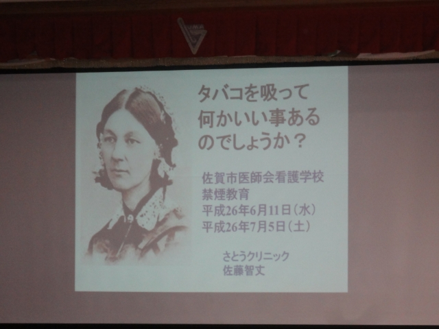 平成26年6月11日(水)、さとうクリニックの佐藤智丈生をお招きして、高等課程1年Aクラスと専門課程1年Aクラスの学生に対し、禁煙対策や喫煙による健康へのリスク等をスライドを使って講話をして頂きました。以下、学生の感想を紹介します。