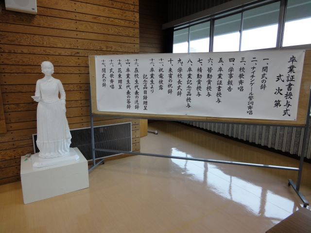 式は在校生代表の送辞、卒業生総代の答辞と続き、式歌を斉唱し閉式しました。