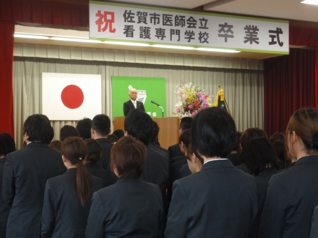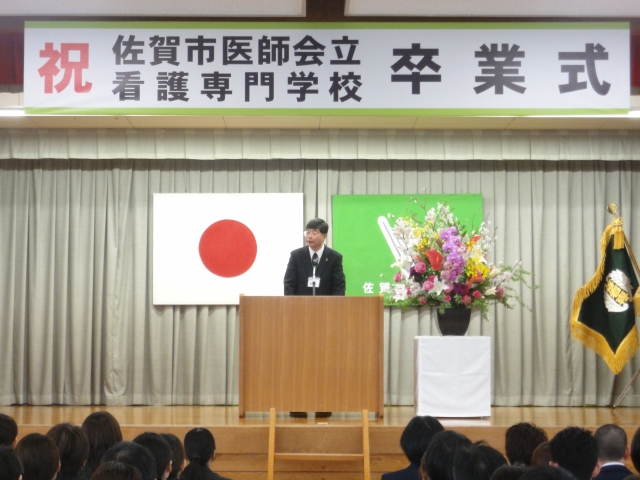 学校長の式辞の後多数の来賓の方々の中から、山口光之佐賀中部保健福祉事務所長様、三根哲子佐賀県看護協会会長様、武富勝朗専門課程同窓会会長様より御祝辞を頂きました。貴重なお時間を割いて御臨席頂いた上に、卒業生に対し励ましとはなむけの言葉を頂戴し、大変有り難く御礼申し上げます。